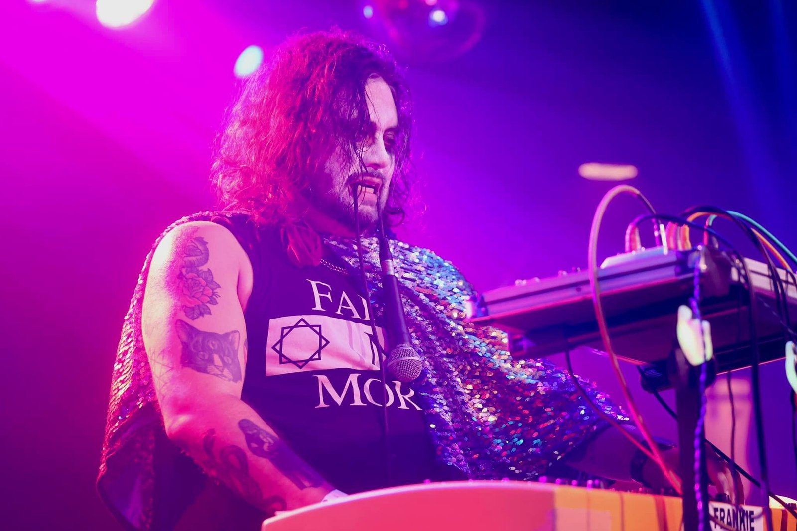 Sure! First off I’d like to give a shout out to the Roland company of America for creating the SP-404 sampler. When I was coming up, it was sacrilegious to use a sampler in your band. Now it’s weird if you don’t have a 404. So yeah, that machine does a lot of the heavy lifting live, along with the Electro Harmonix V256 vocoder for my vocals, a Studiologic Sledge for live synth, and my neon green Dean bass with a Q-Tron. I like the Deans because they are cheap as fuck and I can beat the shit out of them on the road.